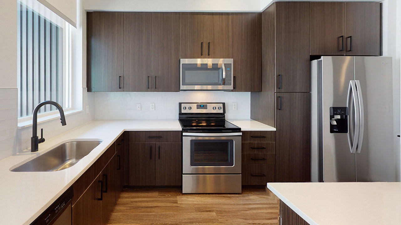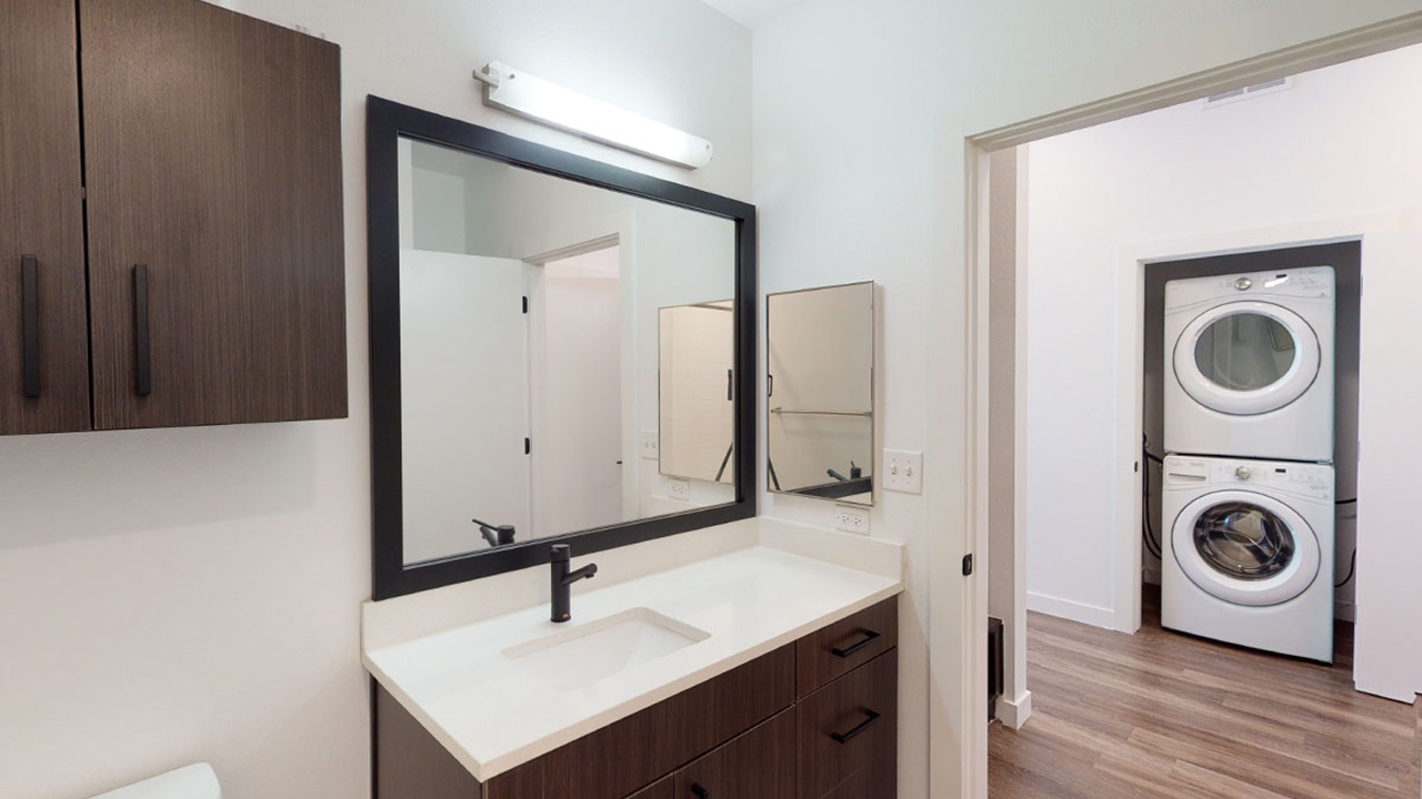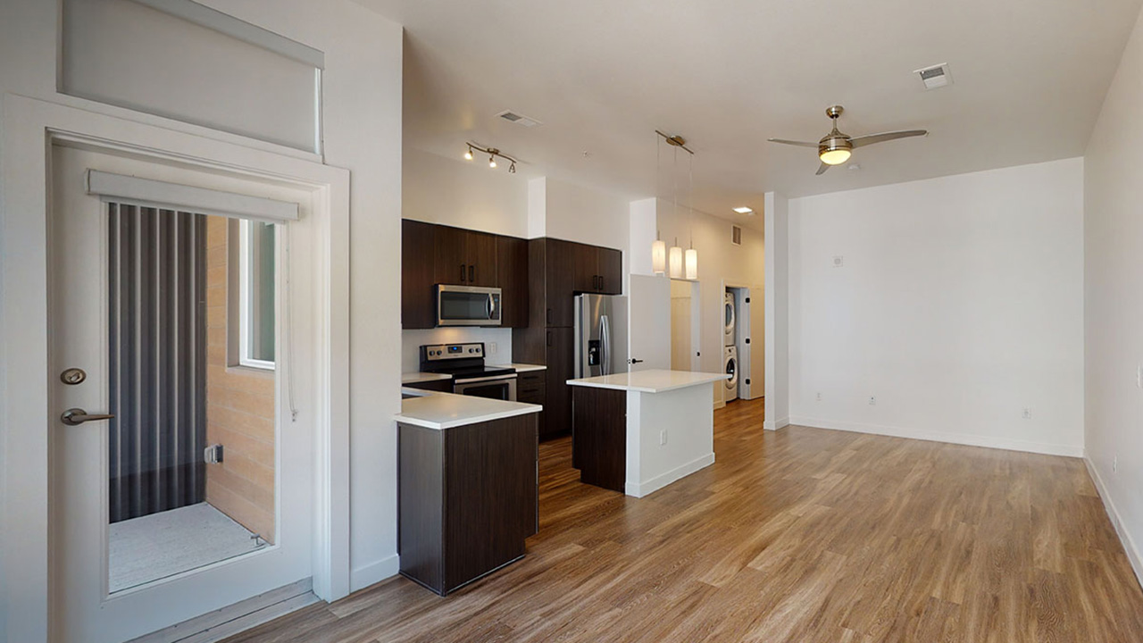This studio, one-bathroom home features an open kitchen and living space that opens out to a private patio in the back. The kitchen features a large kitchen island, adjacent washer and dryer and plenty of storage throughout with built-ins, a spacious closet, standard entry closets and linen storage in the bathroom.