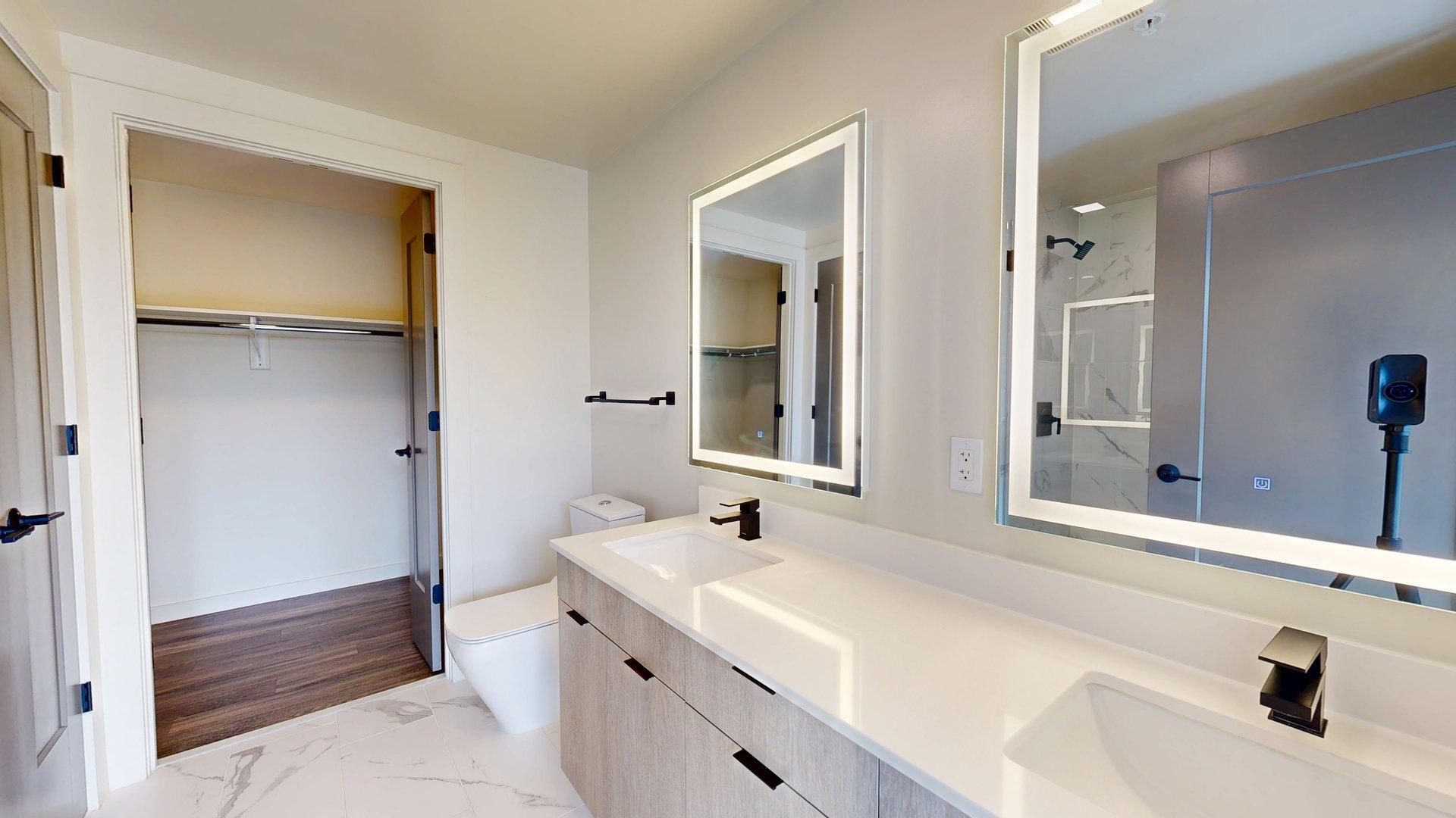 This two-bedroom, two-bath apartment home features a spacious living and dining area that flows into an open-concept kitchen with a pantry. The primary bedroom has a spacious closet and an ensuite bathroom. The secondary bedroom has a spacious closet and connected bathroom that is also accessible from the entry. The entry includes a closet for added storage.