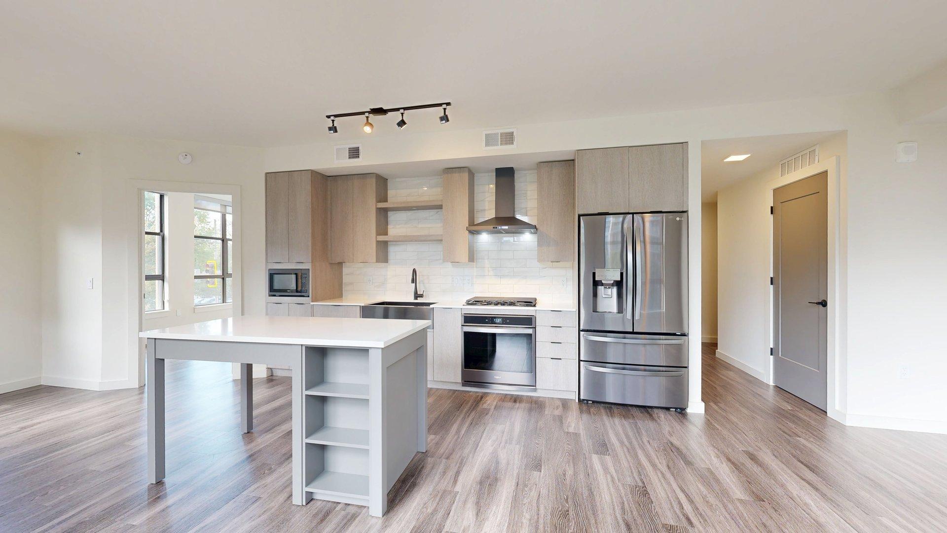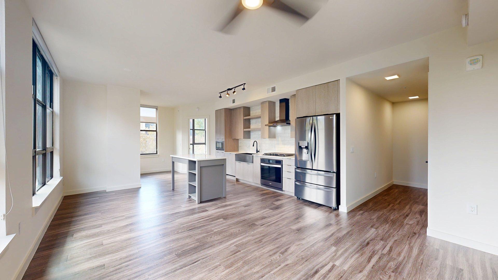 Apartment kitchen with stainless steel appliances, dining and living room with wood-style flooring.