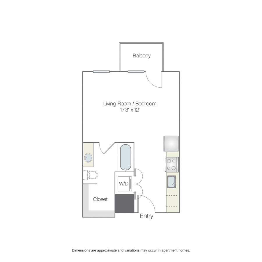 This studio, one-bathroom home features an open kitchen and living space that opens out to a private balcony in the back. The kitchen features an adjacent in-home washer and dryer and standard entry closets.
