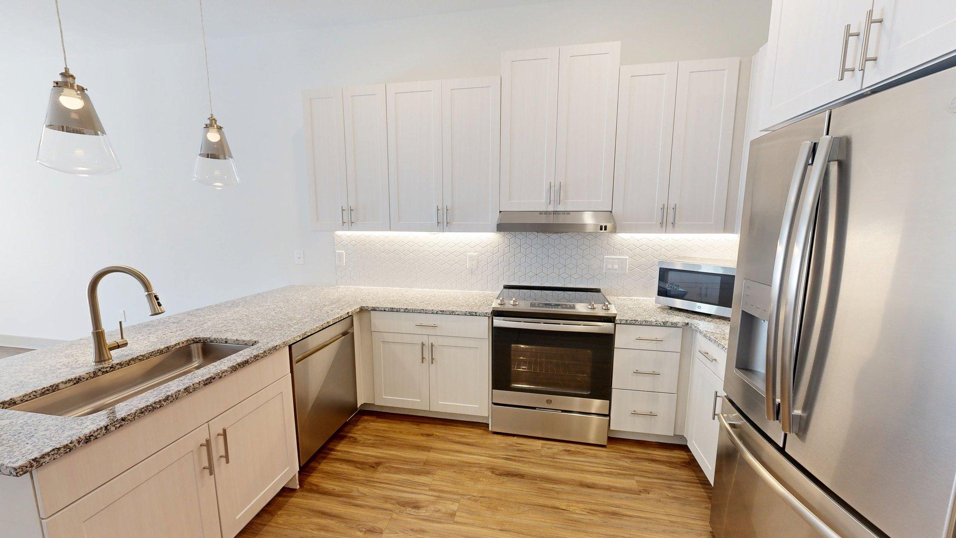 This one-bedroom, one-bathroom floor plan features an open kitchen facing the living/dining area. The living room opens to a private balcony. The bedroom connects to a large bathroom with a spacious closet. The laundry is accessible from the entry.