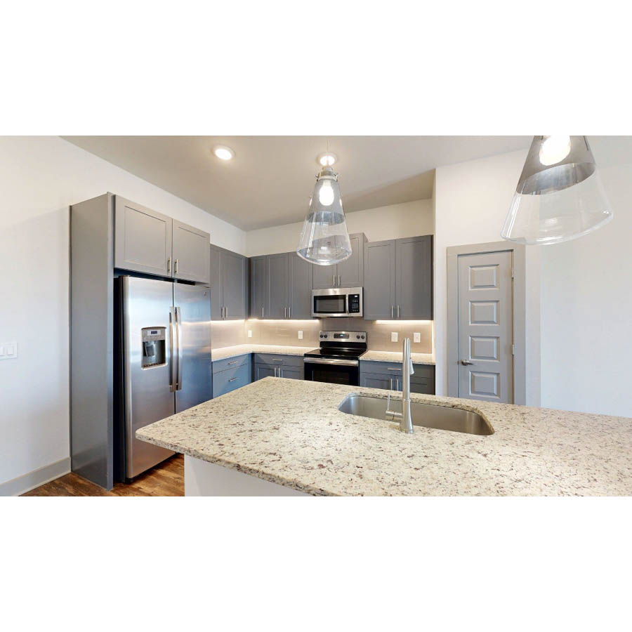 This one-bedroom, one-bathroom floor plan has an open concept kitchen with an island that flows into the living area and connects to a private balcony. The bedroom connects to a bathroom that has an adjacent extra-large closet. The bathroom is also accessible from the main living area, and the laundry is accessible from the entry/kitchen area.