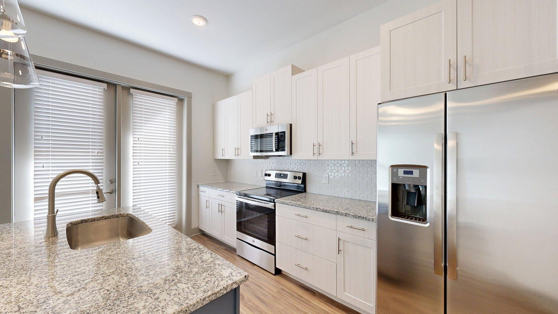 This one-bedroom, one-bathroom floor plan has a long entry hall leading to the living area and an open kitchen with an island. The living area opens to a private balcony. The bedroom is separate from the main space with a spacious closet, and the bathroom is off the hallway.