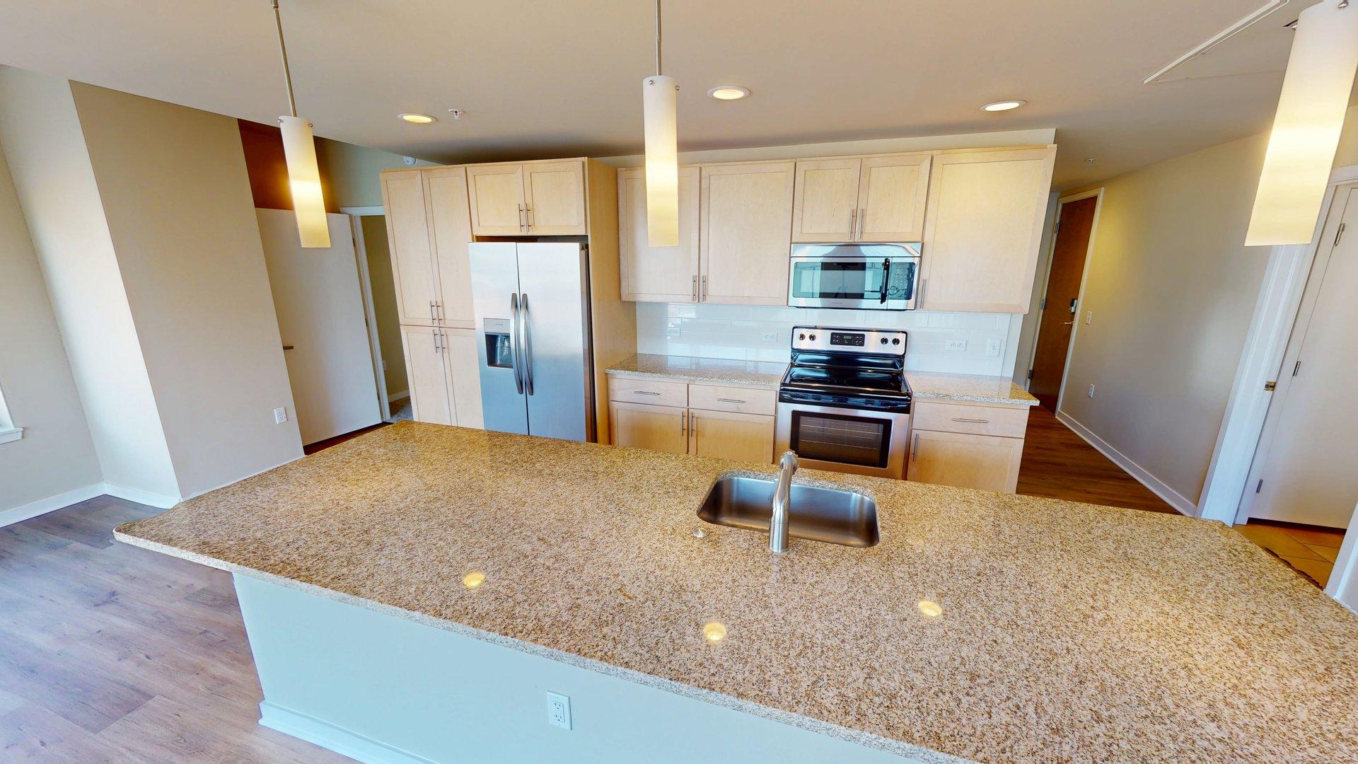 Apartment Kitchen with Stainless Steel Appliances, quartz counters and wood floors.