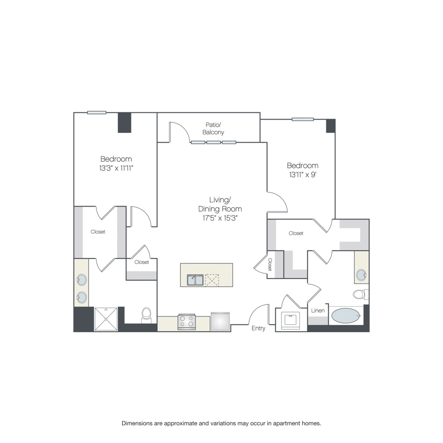 This two-bedroom, two-bathroom apartment for rent features an open kitchen and living area with a breakfast bar and adjacent private patio. Both bedrooms include access to spacious closets and large bathrooms and one bedroom has a half wall. The apartment is complete with in-home washer and dryer and two coat closets.