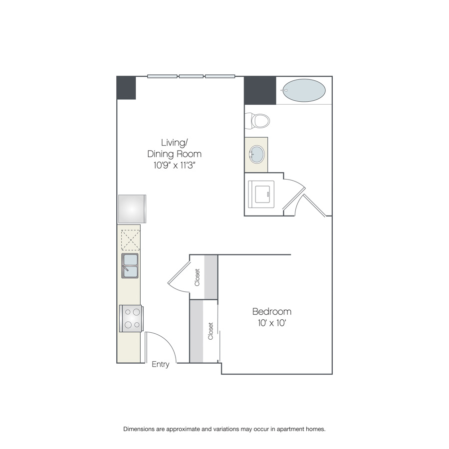 This studio apartment for rent features separate sleeping and living areas. The bedroom space has a three-quarter wall and includes a closet. The large bathroom features in-home laundry and the kitchen features additional closet storage.