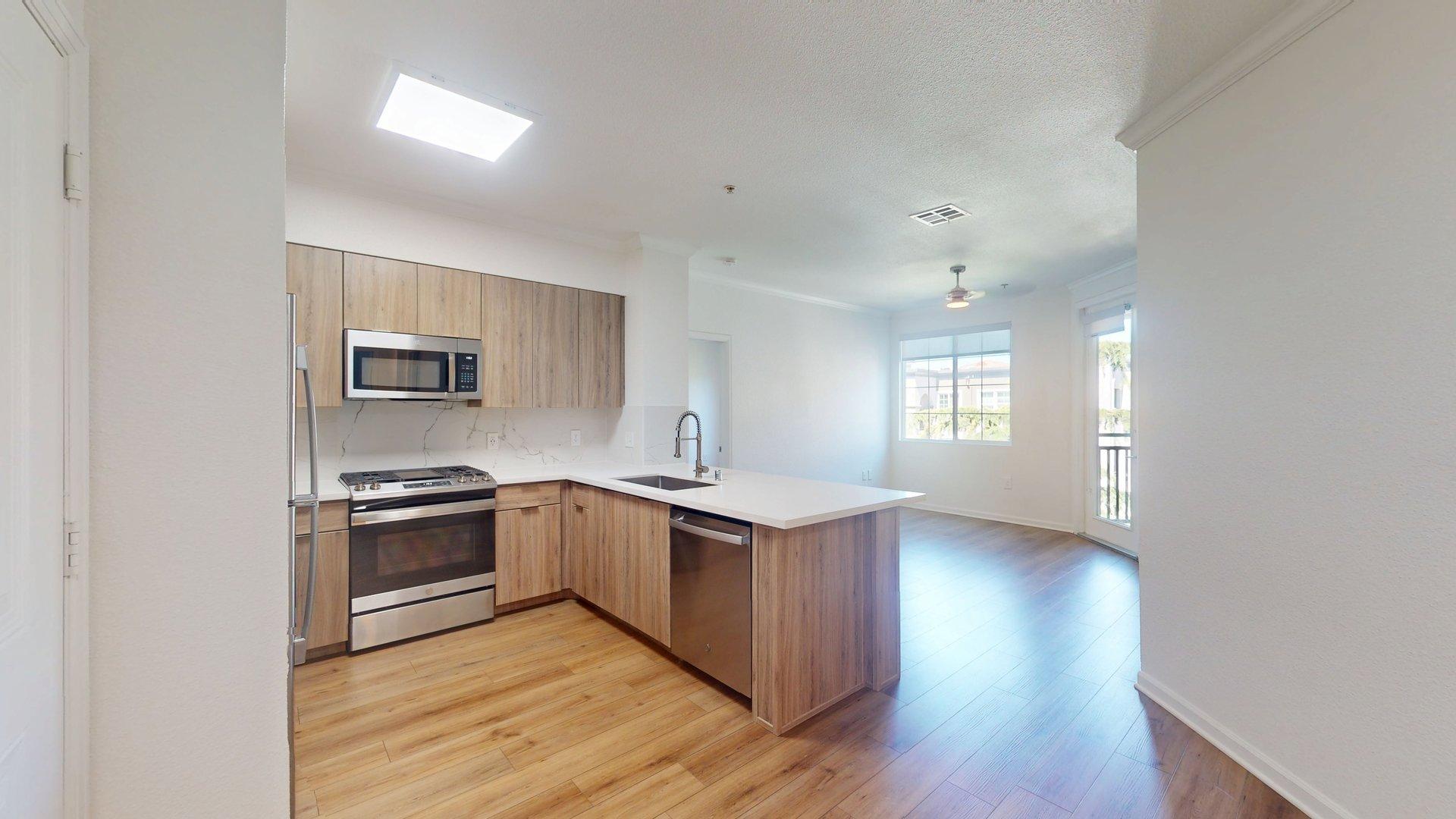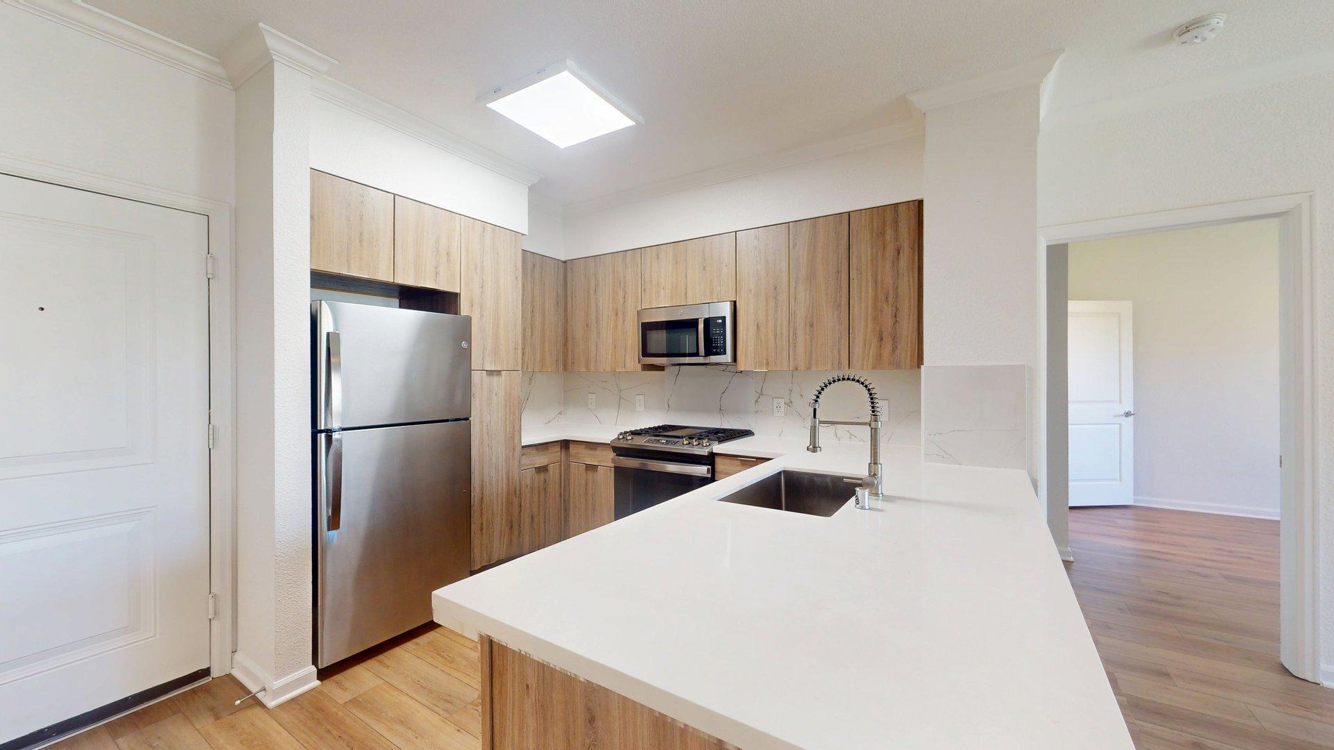 Apartment kitchen with stainless steel appliances, quartz countertops and wood-style flooring.