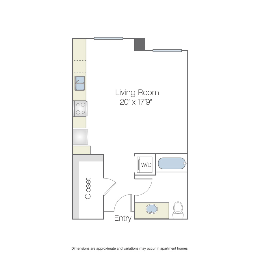This studio, one-bathroom apartment home features a large bedroom/living/kitchen area. The bathroom includes an oval soaking tub and is across from a spacious closet.