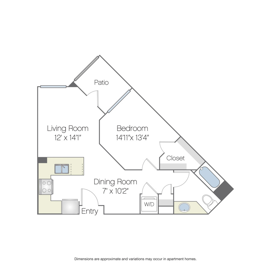 This one-bedroom, one-bathroom apartment home features a large dining/kitchen/living room with patio/balcony access. The bedroom offers a spacious closet and in-home washer and dryer.