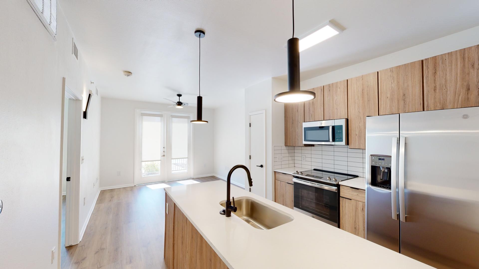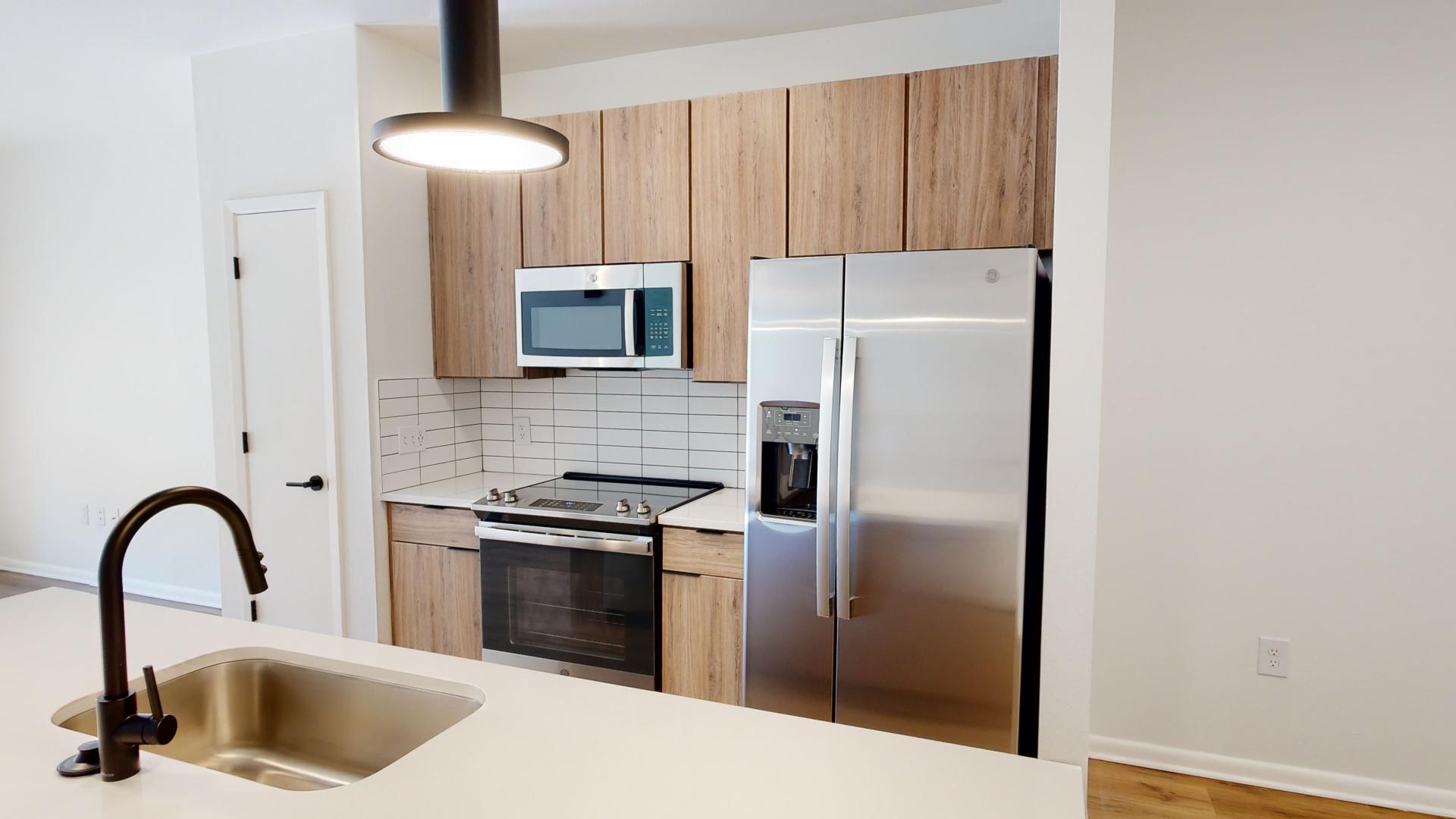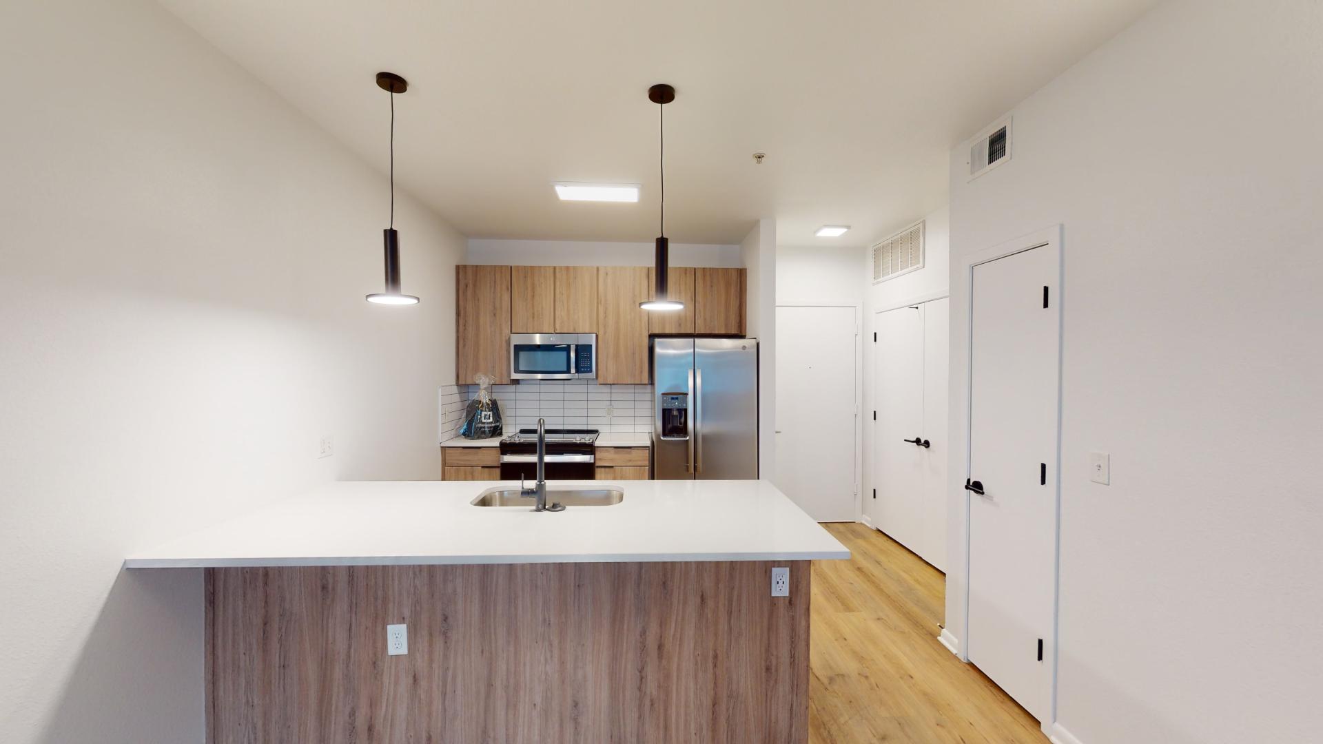 Apartment kitchen with stainless steel appliances, quartz countertops and wood-style flooring.