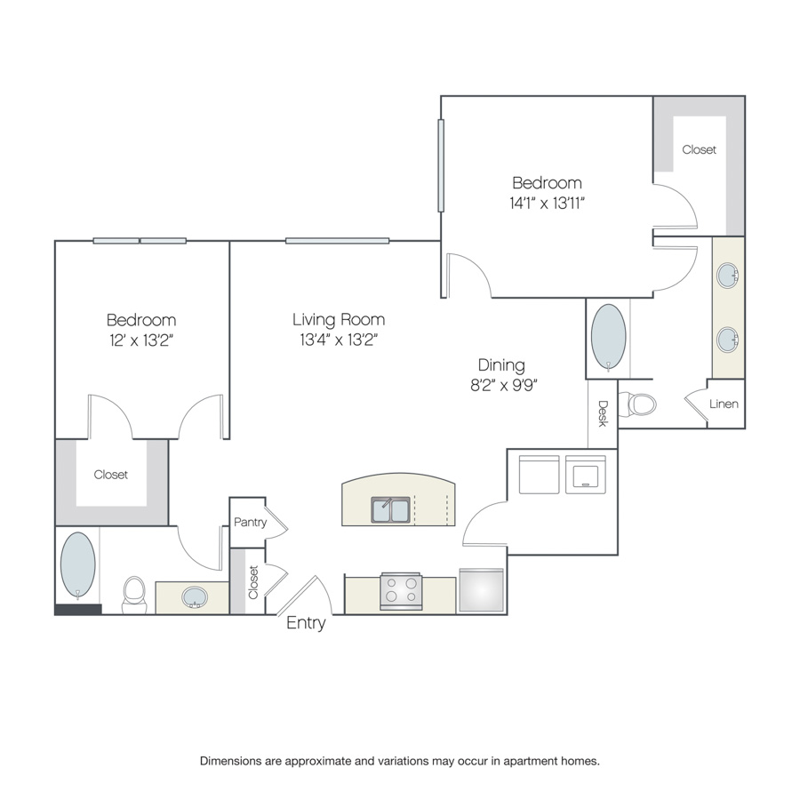 Rendering of the Cordoba floor plan with 2 bedroom[s] and 2 bathroom[s] at Griffis at The Domain