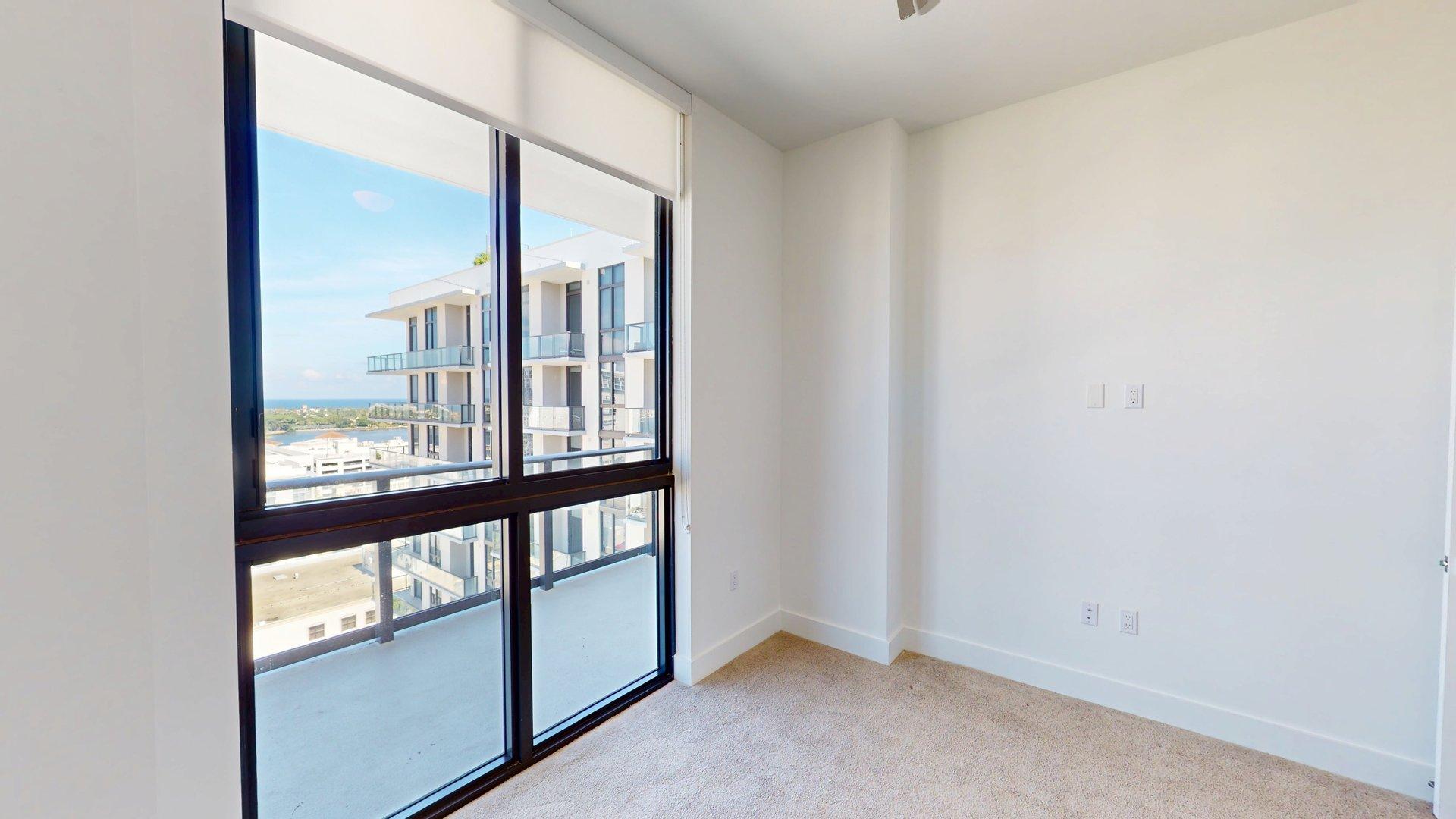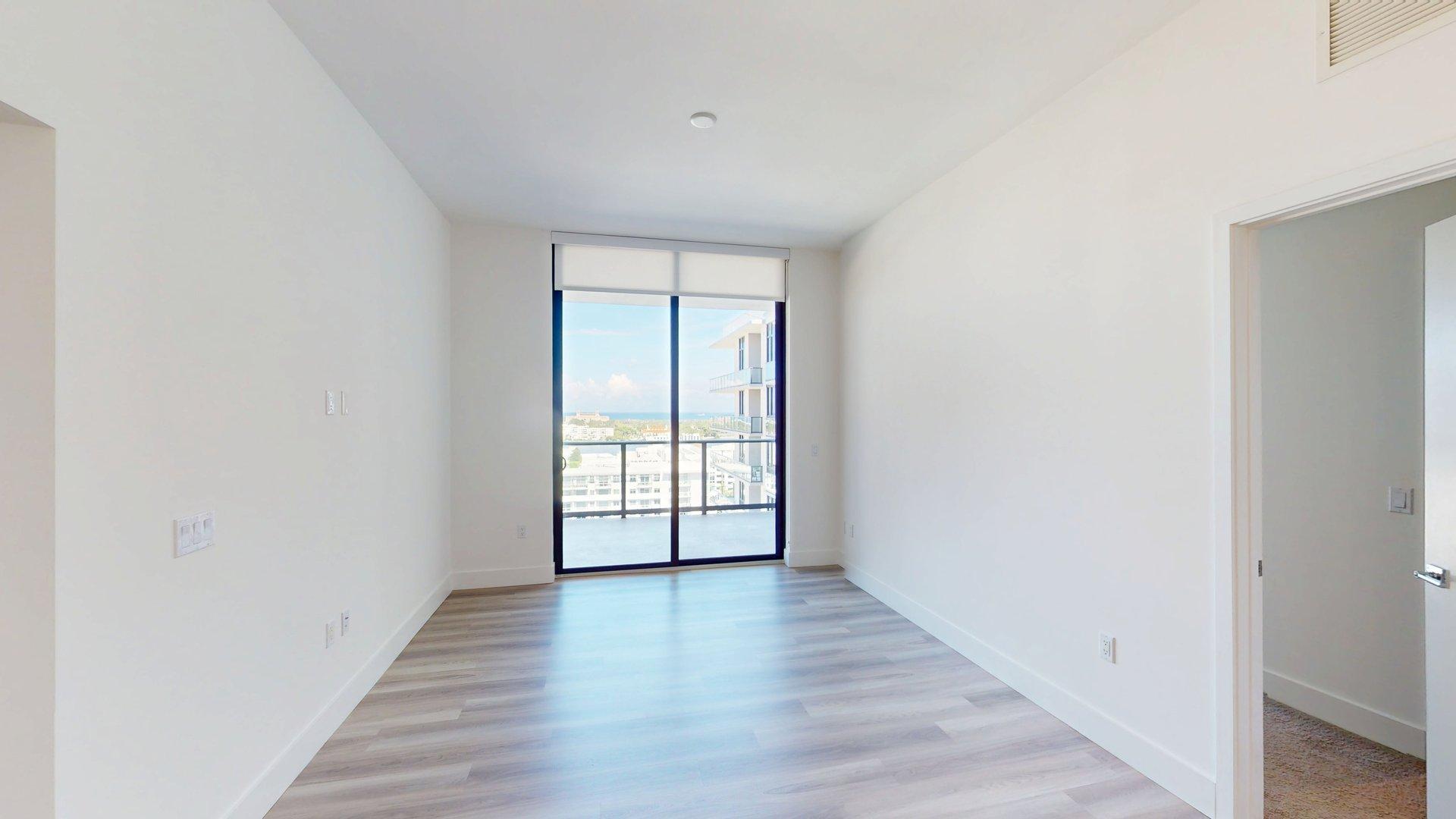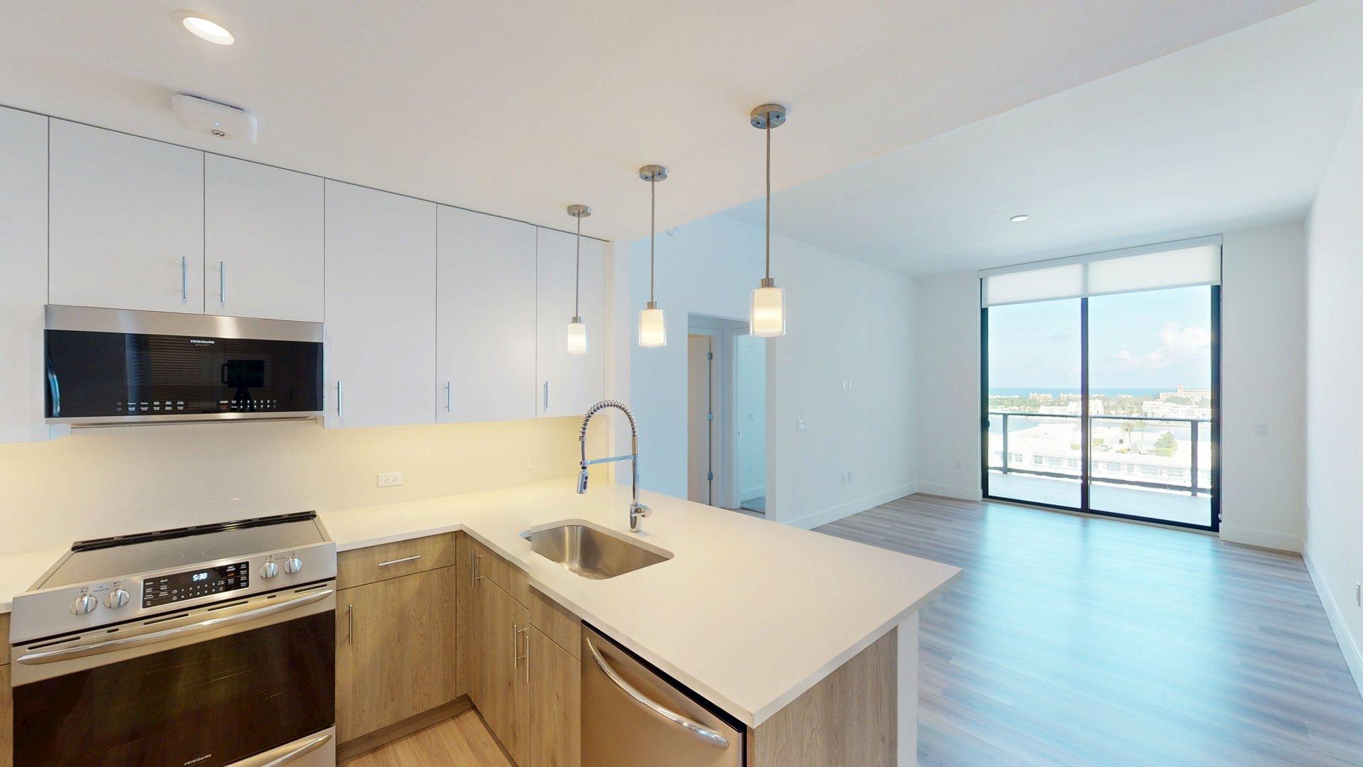 This three-bedroom, two-bath floor plan offers a spacious living area that opens to an extra large private balcony. The kitchen features a pantry and is positioned near the entry. The primary bedroom features a spacious closet and en suite bath. The other two bedrooms share a bathroom.